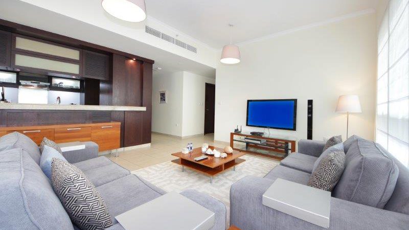 The apartment is fully furnished and equipped to ensure your comfort. It consists of a large living room, two separate bedrooms, semi-closed kitchen, a balcony, two full bathrooms and a powder room. Free internet WiFi and TV is available. Swimming pool and gym is available in the building along with other spa and free time facilities to enhance your stay.