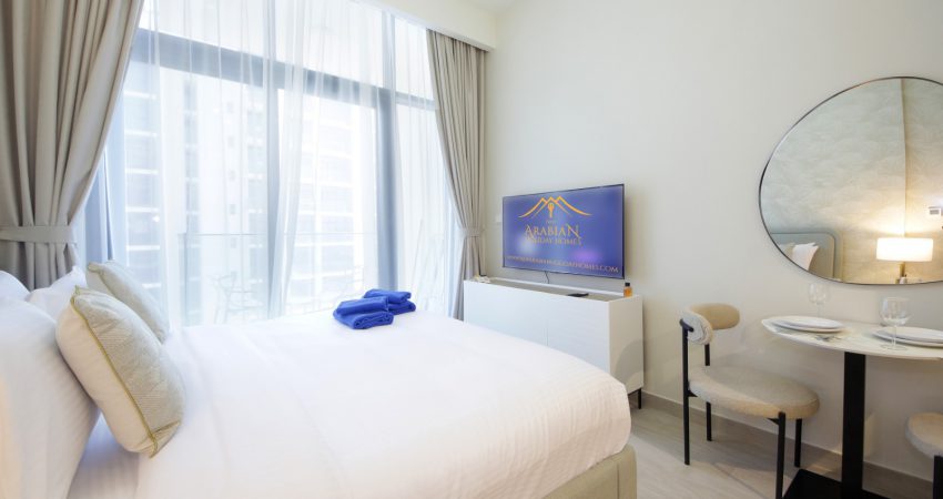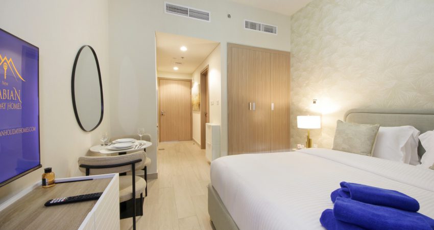 This fully furnished studio apartment by New Arabian Holiday Homes is perfect for solo travelers or small families. With a scenic balcony offering pool views, it combines comfort and convenience in a prime location.