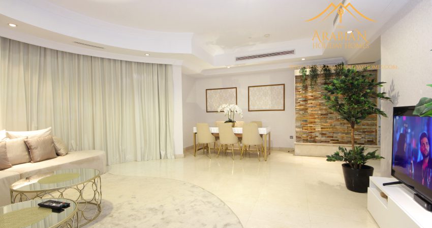 The apartment is fully furnished and equipped to ensure your comfort. It consists of a large living area, three separate bedrooms, closed kitchen, a balcony, three full bathrooms and a powder room, Maid’s room and a study area, Free internet WiFi and TV is available. Swimming pool and gym is available next to the building along with other spa and free time facilities to enhance your stay.